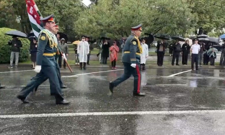 Подразделения Сухумского гарнизона Минобороны РА, 7-й российской военной базы и Пограничного управления ФСБ России в Абхазии прошли торжественным маршем по улице Аидгылара у Парка Славы.